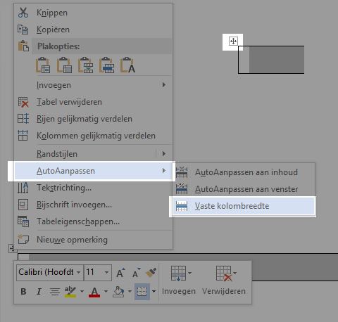 Om er voor te zorgen dat de kolommen een vaste breedte behouden en niet van afmeting veranderen kan de kolombreedte vastgezet worden. Klik op de tabel zodat er links bovenin de tabel een een icoontje met een kruisje verschijnt. Klik met de rechtermuisknop op het icoontje en kies vervolgens AutoAanpassen en daarna Vaste kolombreedte