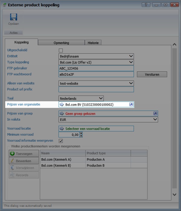 Selecteer bij prijzen van organisatie de organisatie waarmee u de koppeling wilt realiseren.