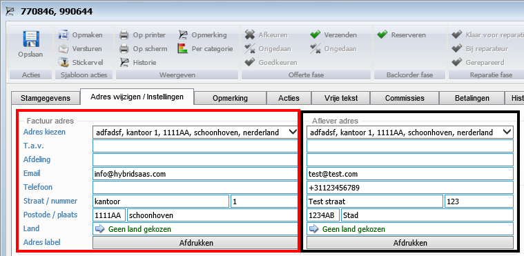 - Het factuuradres is het adres van de tegenpartij welke is ingevuld in de koppeling (rood)