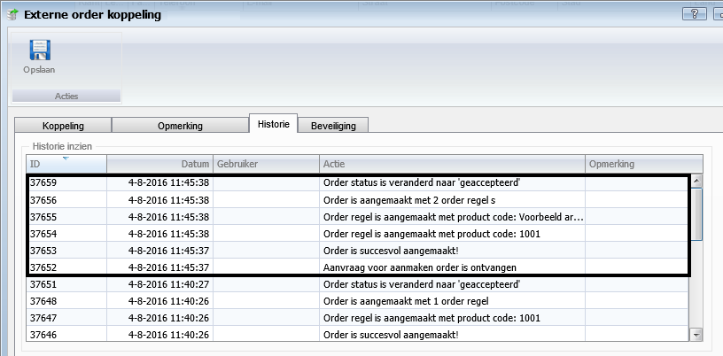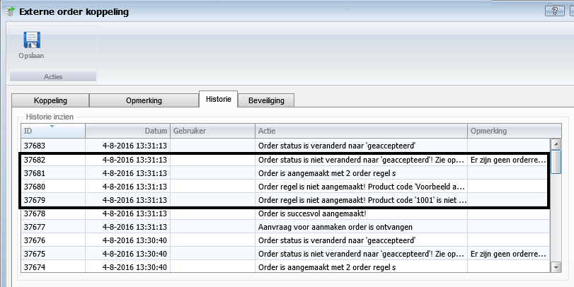 Het kan ook zijn dat de melding OK is bevonden maar dat de order toch niet volledig is aangemaakt. Deze meldingen zijn in de historie van de koppeling terug te vinden